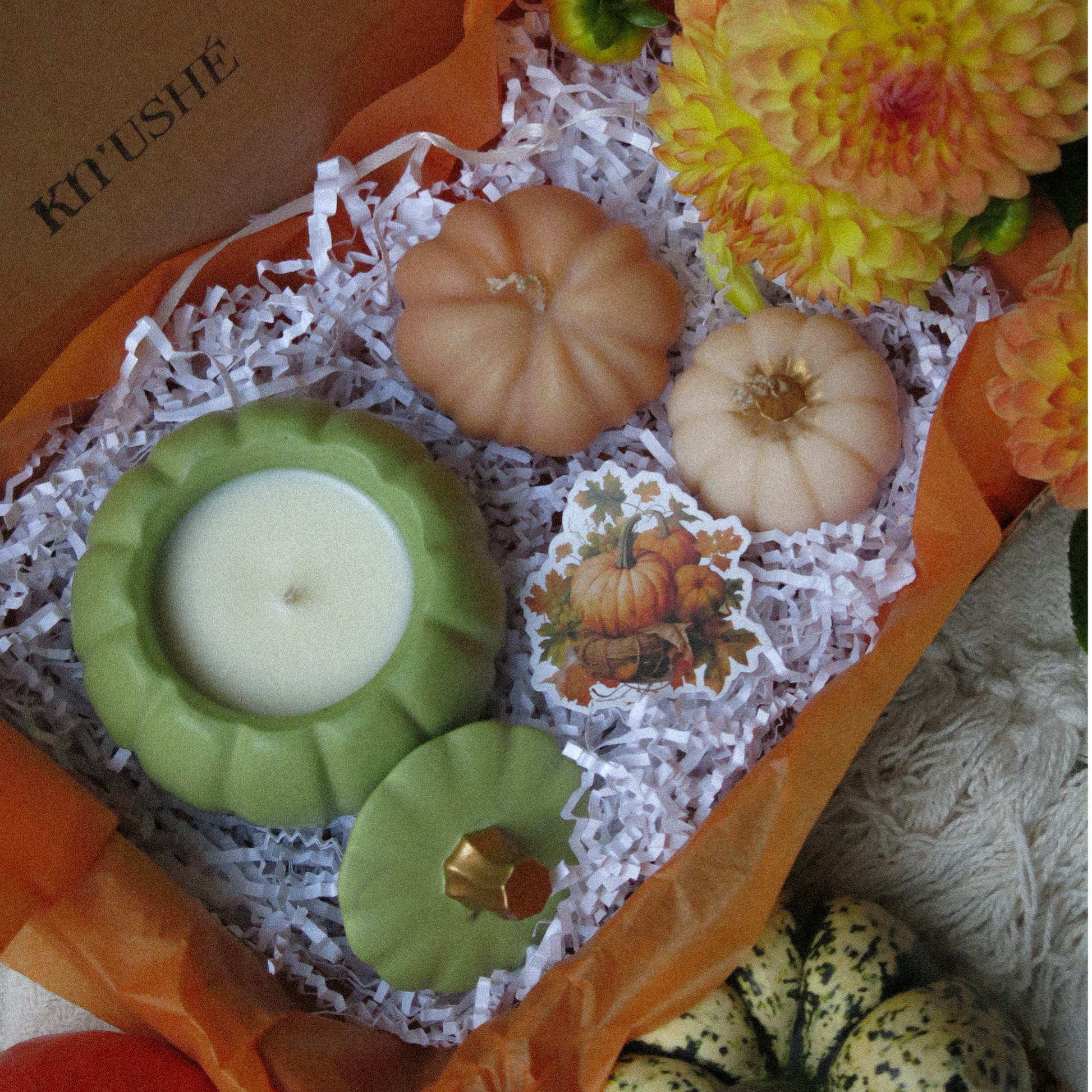 The gift set includes a pumpkin candle and two pumpkin decorative candles.
