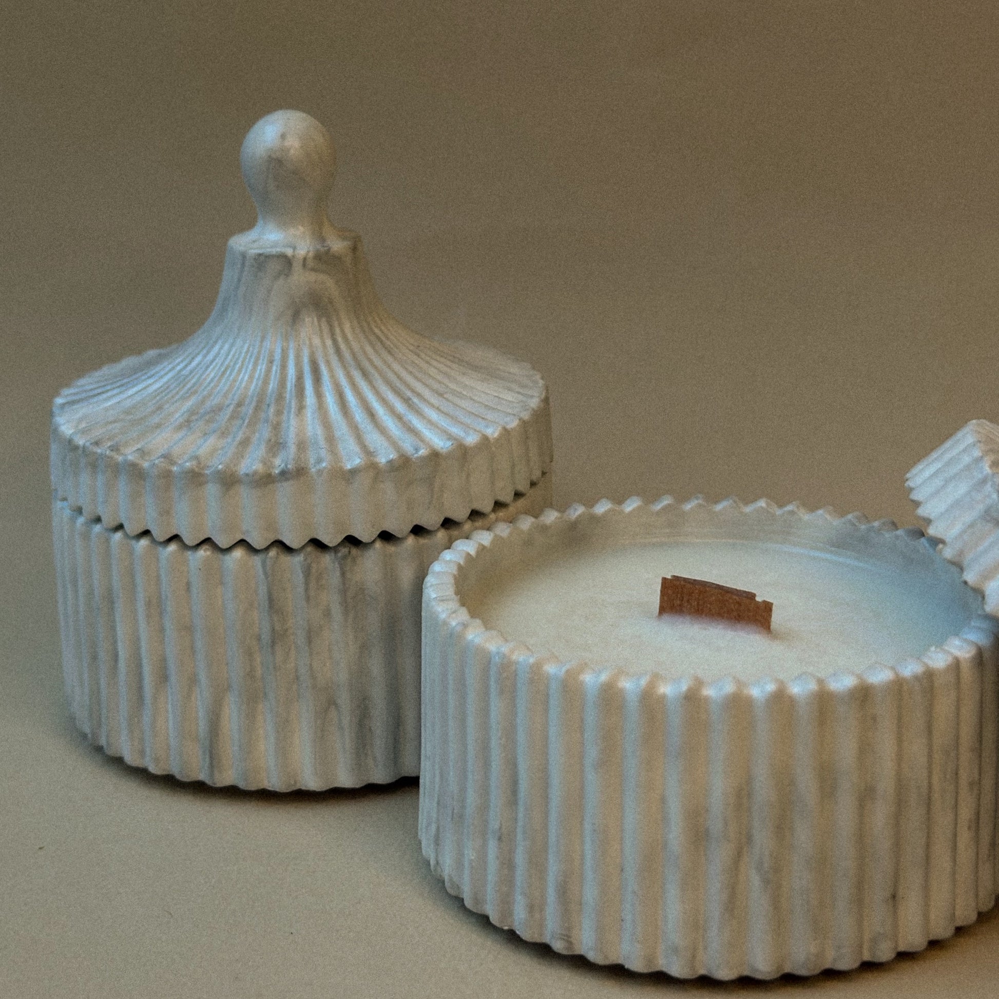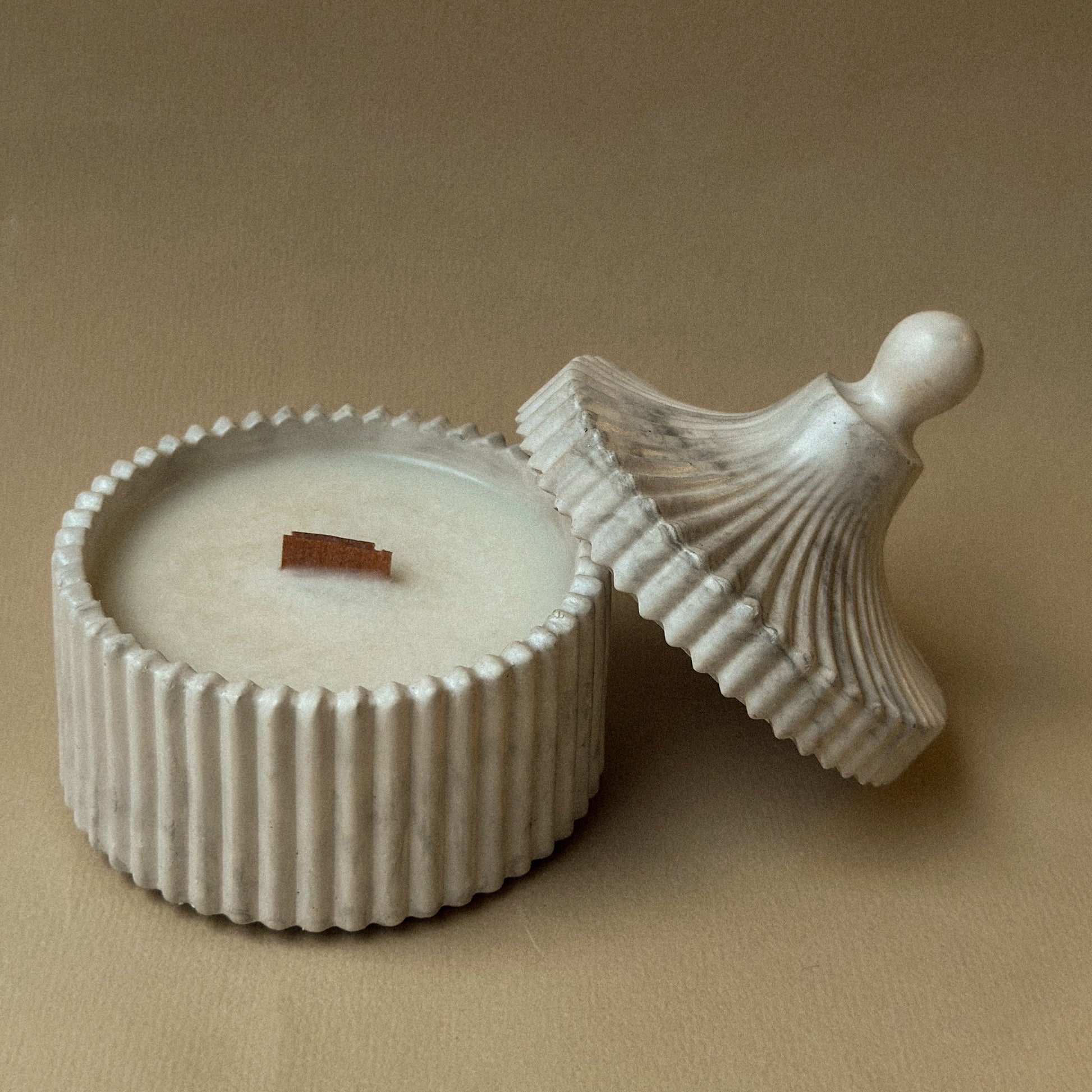 Aromatic candle in a handmade marble plaster box with a wooden wick that crackles when it burns.