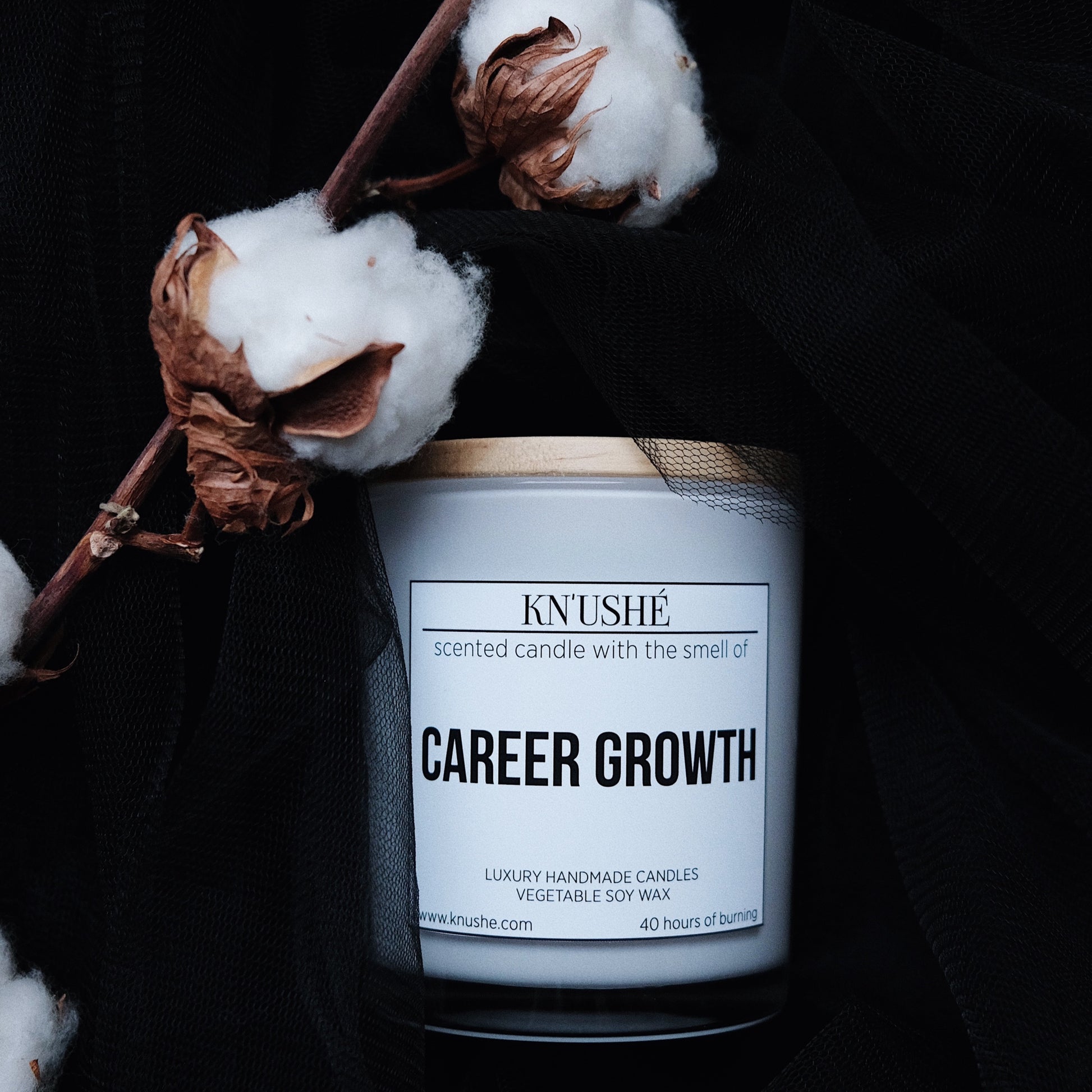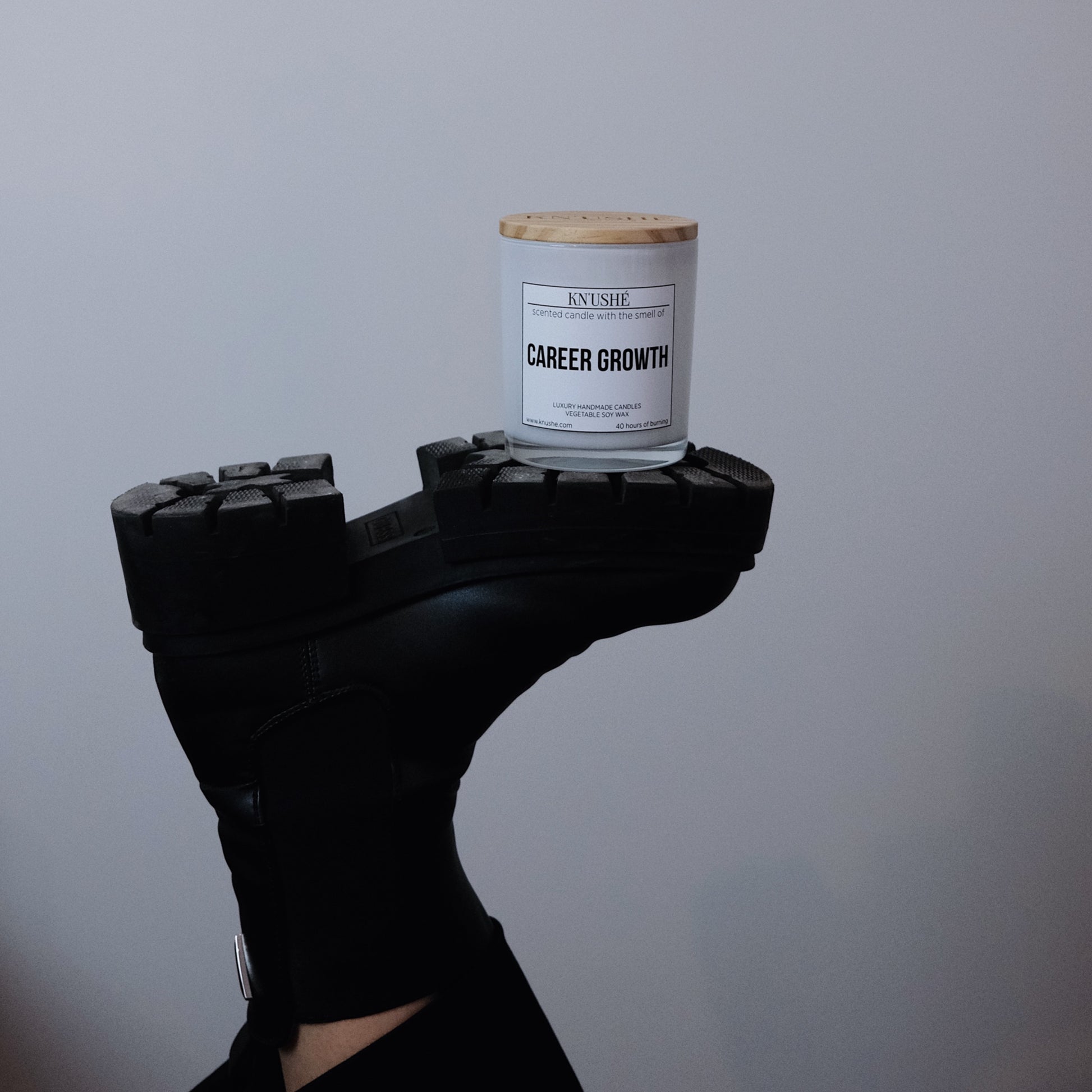 Scented candle with a crinkling wooden wick made from vegetable soy wax.